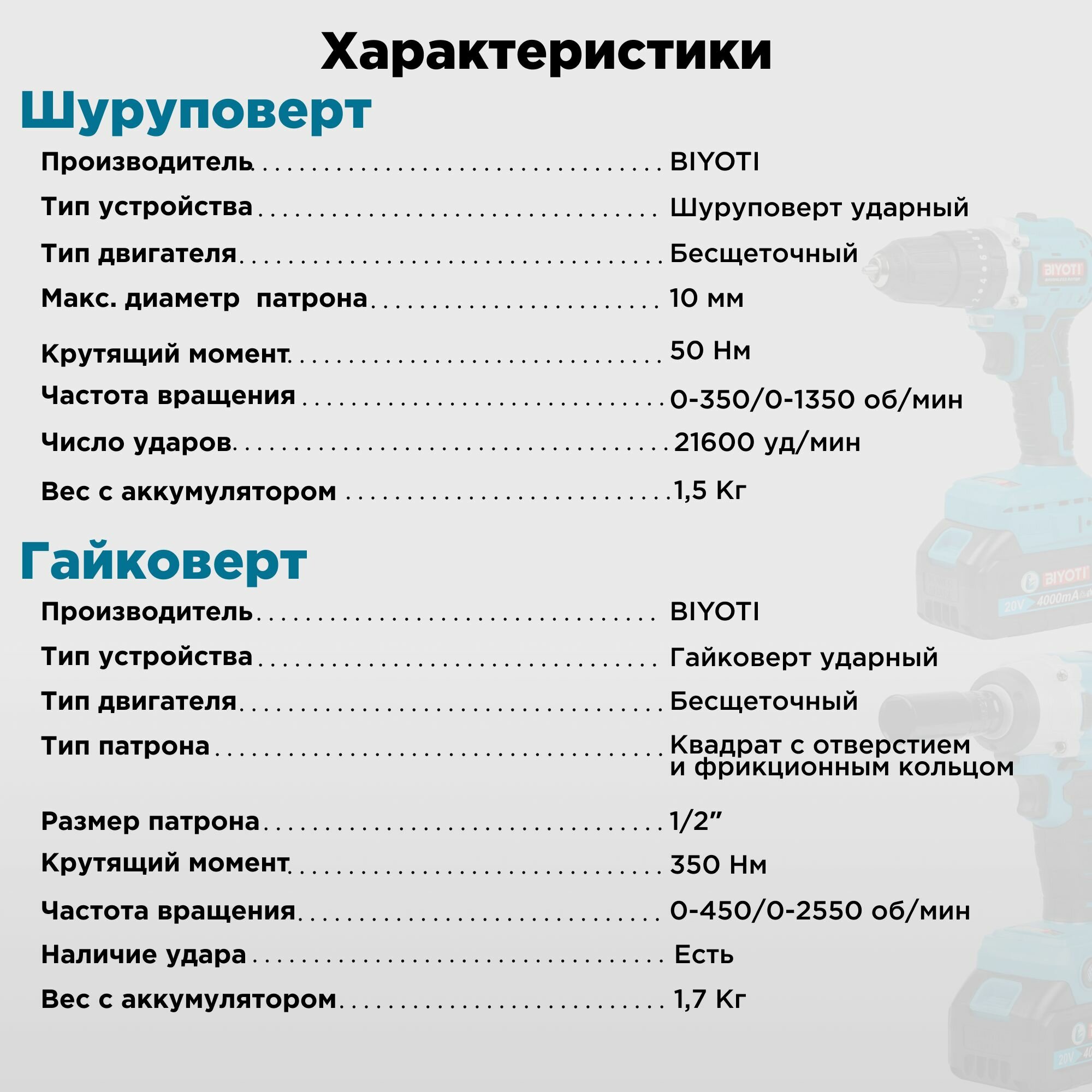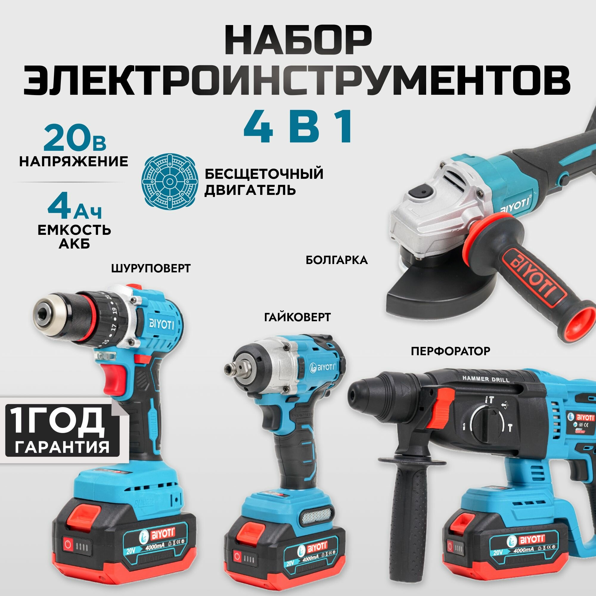 | Инструмент в наборе | гайковерт / перфоратор / угловая шлифмашина / шуруповерт |
