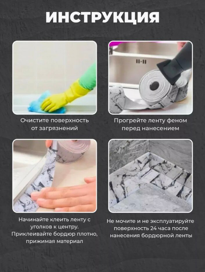 Лента бордюрная мрамор, водонепроницаемая длина 3.2м., ширина 3.8см. Защита от воды, жира, грязи, плесени интересное: