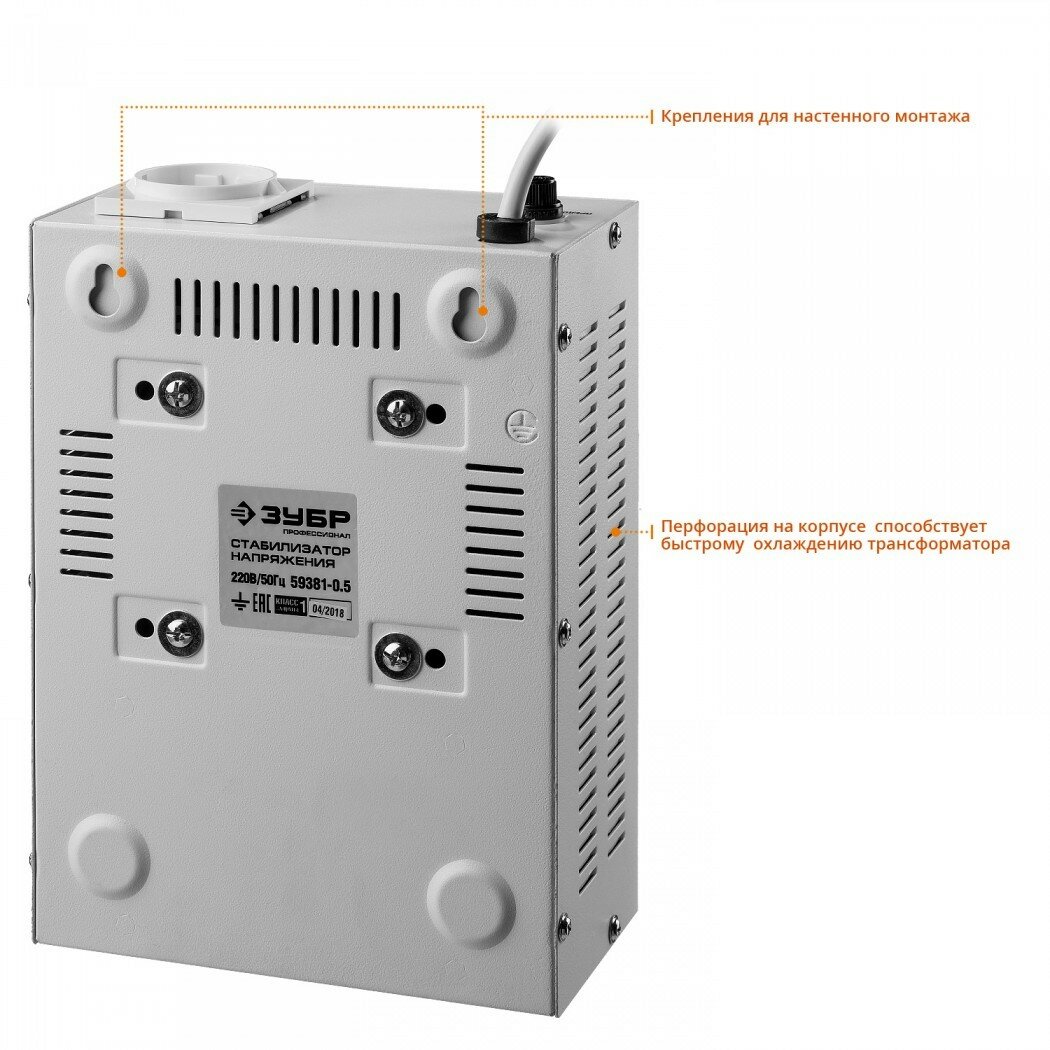 ЗУБР АСН 500 профессиональный стабилизатор напряжения навесной 500 ВА, 140-260 В, 8%, 59381-0.5