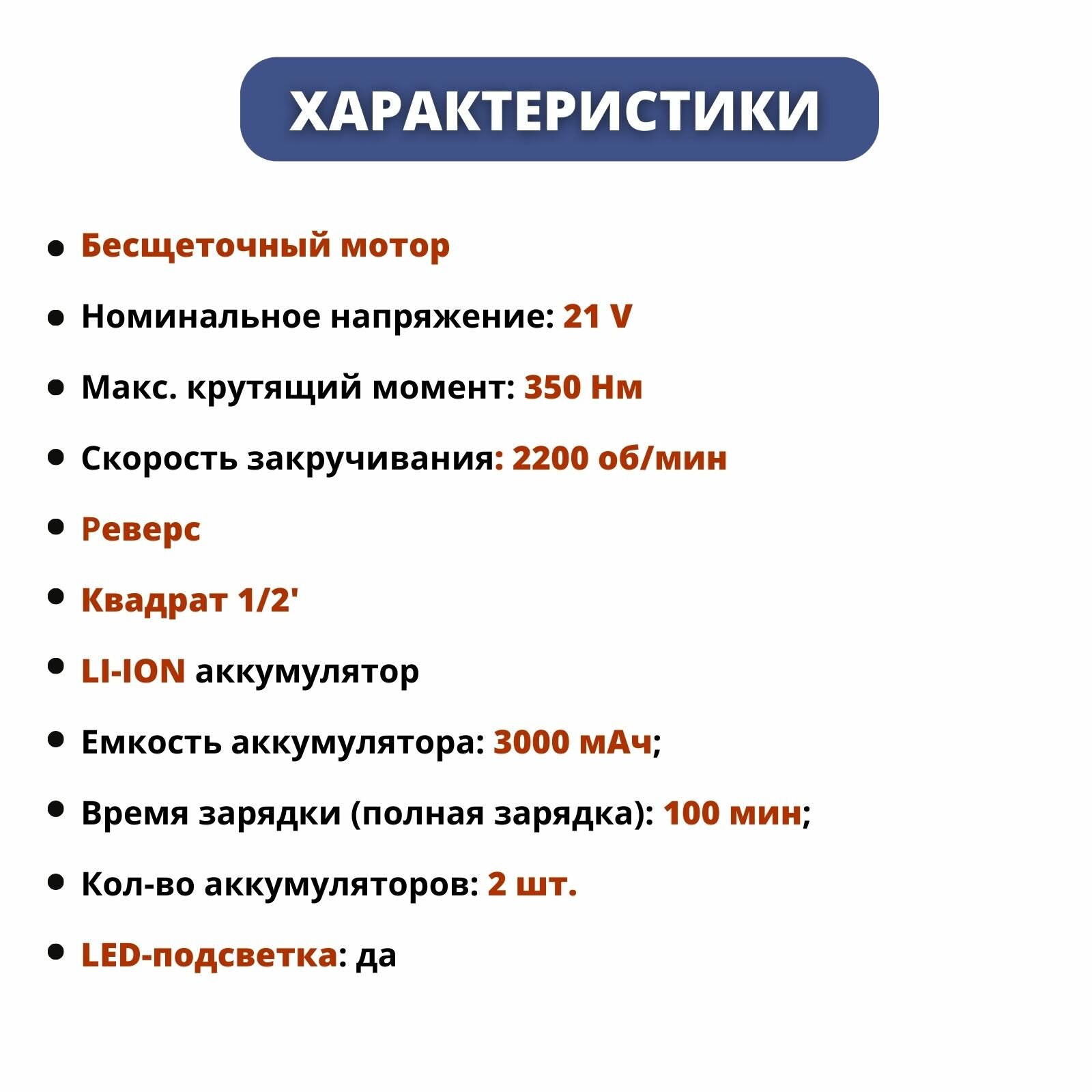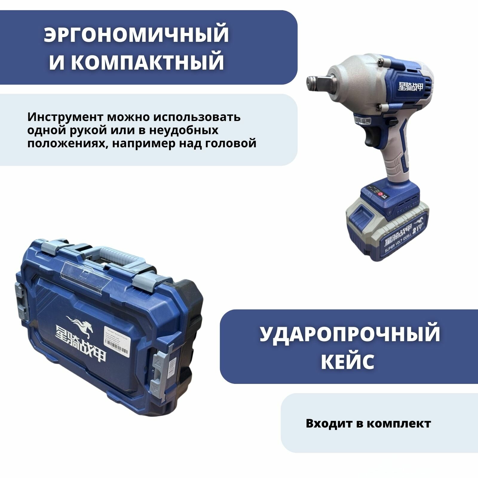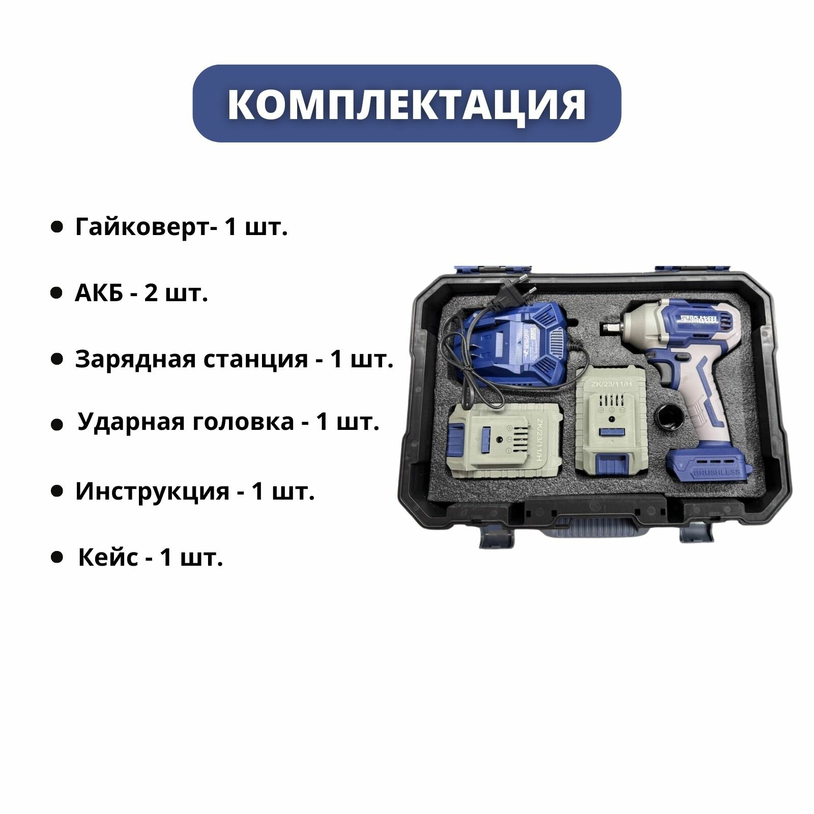 | Комплектация | Гайковерт- 1 шт. АКБ - 2 шт. Инструкция - 1 шт. Кейс - 1 шт. Зарядная станция - 1 шт. Ударная головка 22 мм - 1 шт. |
