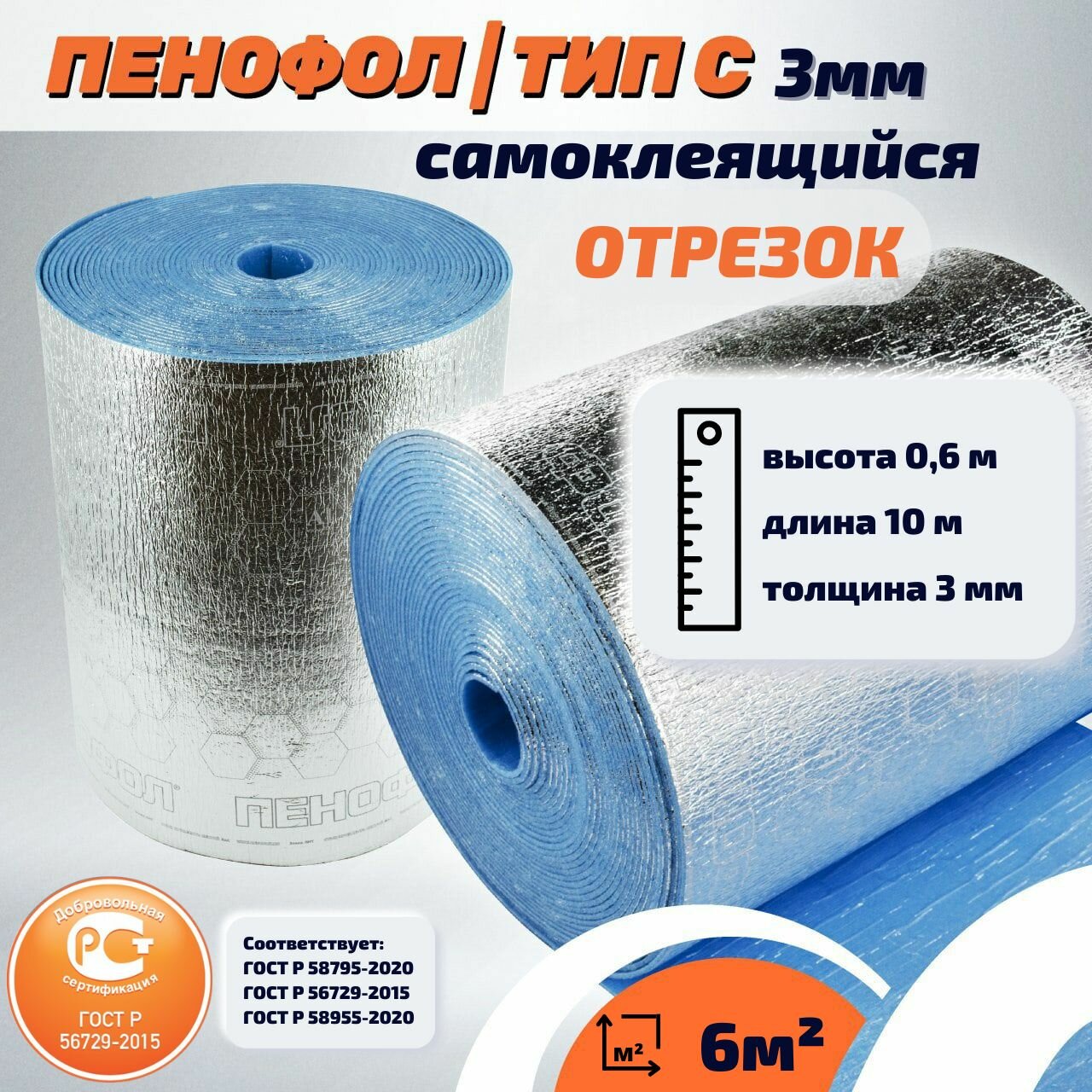 Купить Отрезок Фольгированный утеплитель пенофол 2000 С3 3 мм самоклеящийся ГОСТ 10 метров (6м2)
