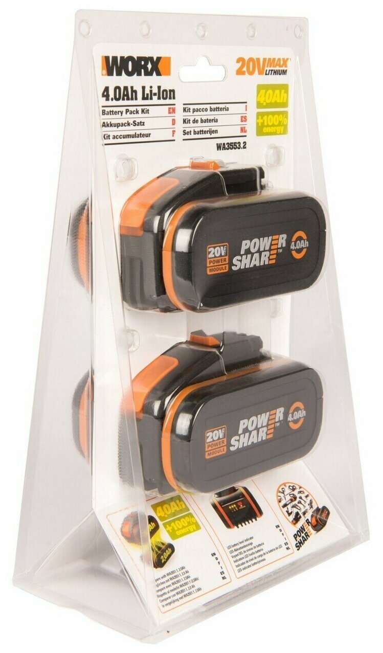 Комплект WORX WA3553.2: 2х аккумулятор 2*20В 4.0 А/ч .