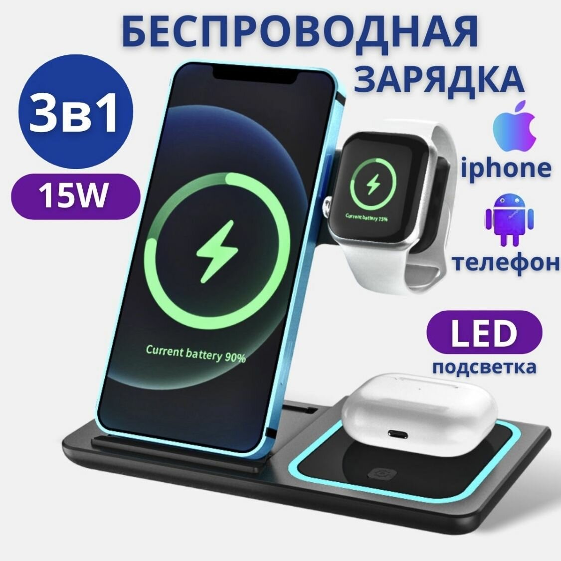 Беспроводная зарядка/Док станция 4 в1 / Быстрая зарядка для телефона, наушников, часов интересное: