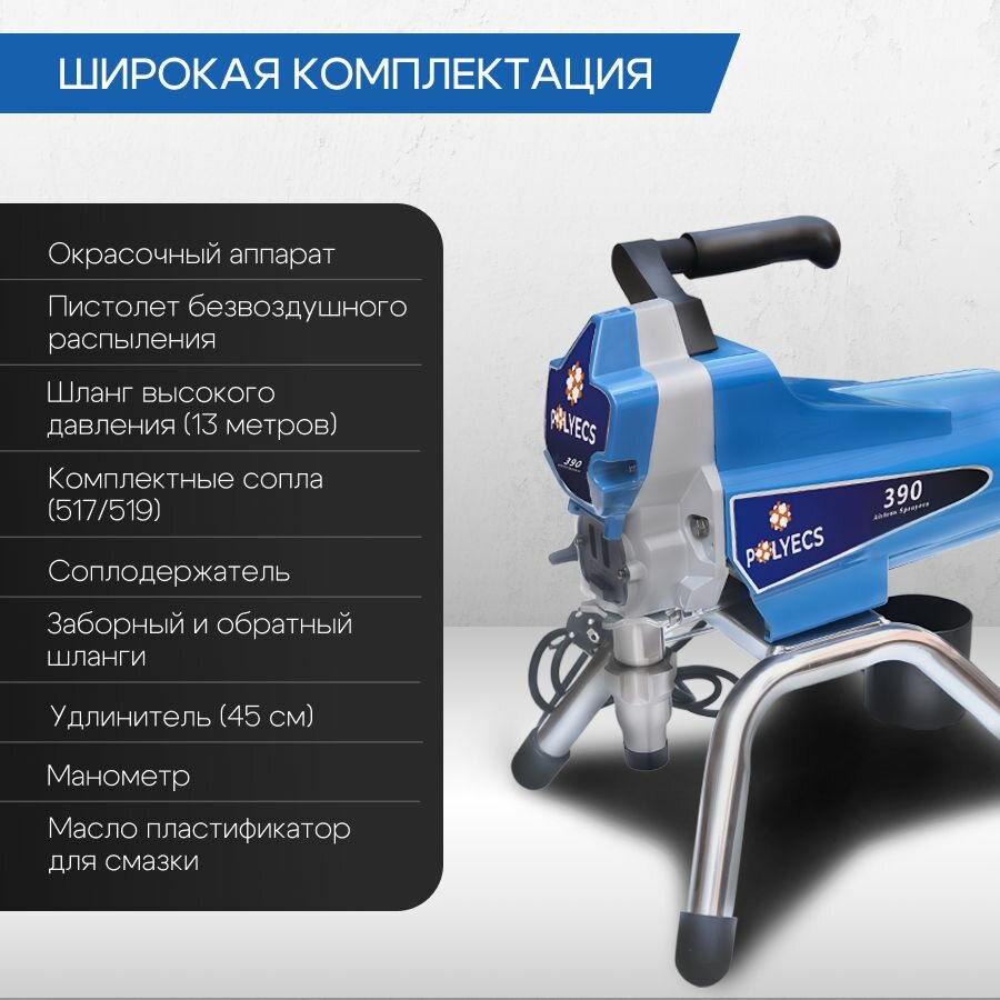 | Подробная комплектация | -пистолет безвоздушного распыления; -шланг высокого давления -13 метров; -комплектные сопла - 517/519; - соплодержатель; - заборный и обратный шланги; - удлинитель(удочка)-45 см ; - манометр; - масло пластификатор для смазки. |
