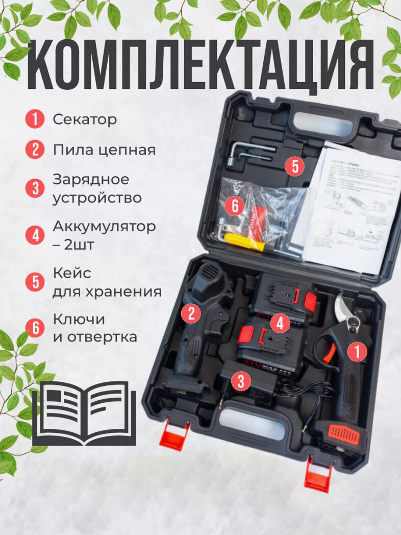 | Комплектация | Секатор аккумуляторный - 1 шт; Пила цепная аккумуляторная - 1 шт; Аккумулятор - 2 шт; Ключ - 3 шт; Отвертка - 1 шт; Зарядное устройство - 1 шт |