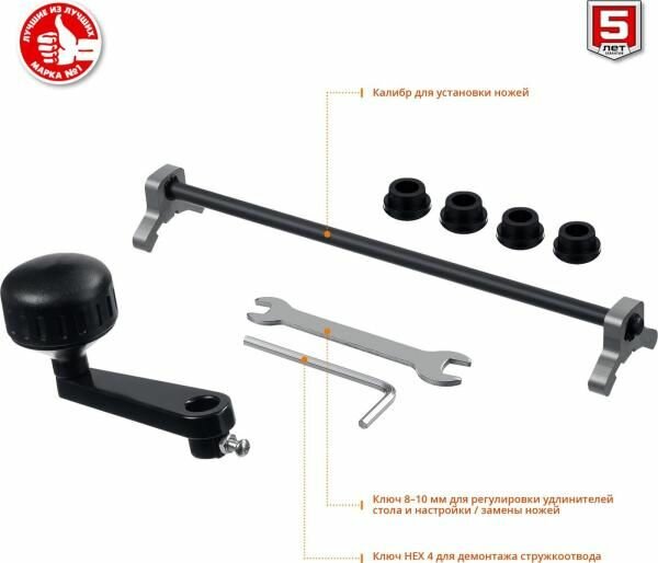 | Комплект поставки | Станок рейсмусовый 1 шт. Рукоятка регулировки высоты 1 шт. Калибр установки ножей 1 шт. Опора резиновая 4 шт. Ключ гаечный 1 шт. Ключ имбусовый 1 шт. Инструкции по безопасности 1 экз. Руководство по эксплуатации 1 экз. |