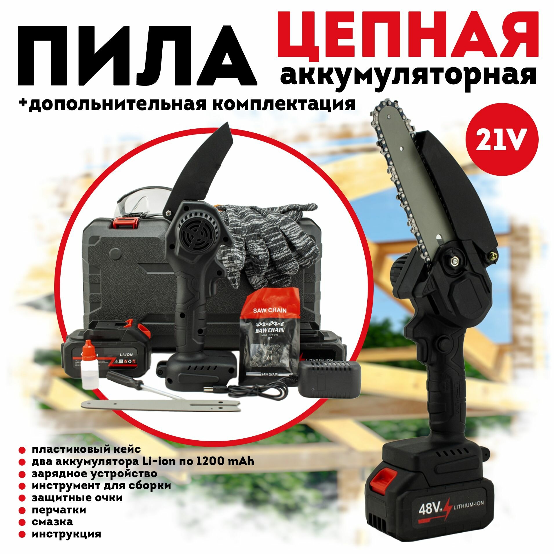 Аккумуляторная цепная пила с двумя аккумуляторами в кейсе, сучкорез интересное: