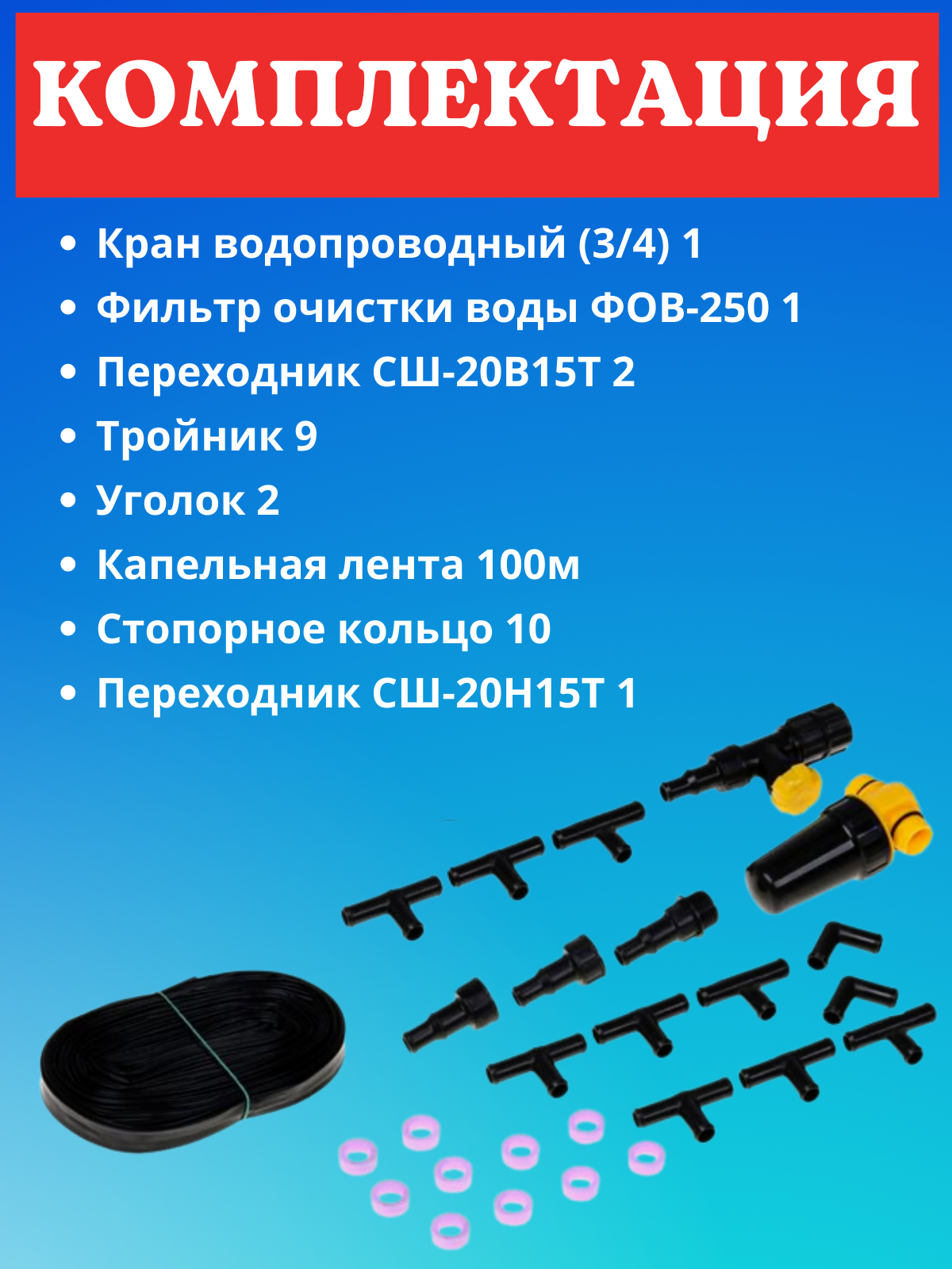 | Комплектация | 1. Капельная лента (диаметр 16 мм, длина 100 метров) 1 рулон 2. Кран водопроводный 1 шт, 3. Фильтр очистки воды ФОВ-250 1 шт, 4. Переходники 3 шт, 5. Тройник 9 шт, 6. Уголок 2 шт, 7. Стопорное кольцо 10 шт, 8. Кольцо уплотнительное 1 шт. |