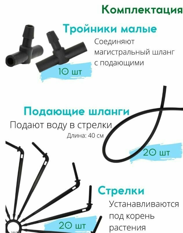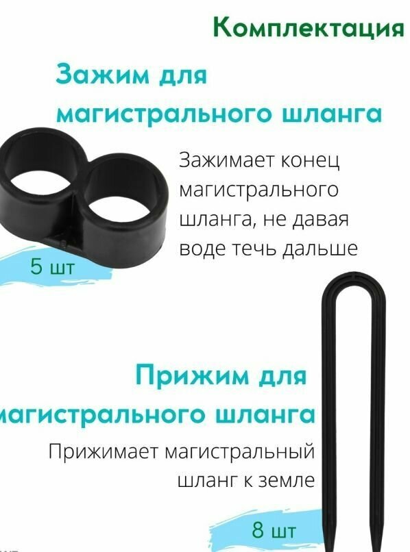| Комплектация | шланг подающий 40 см -20 шт, капельницы - 20 шт, тройник малый - 10 шт, кран - 3 шт, уголок для магистрального шланга - 5 шт, тройник большой - 5 шт, заглушка для магистрального шланга - 5шт, прижимы для магистрального шланга 8 шт. |