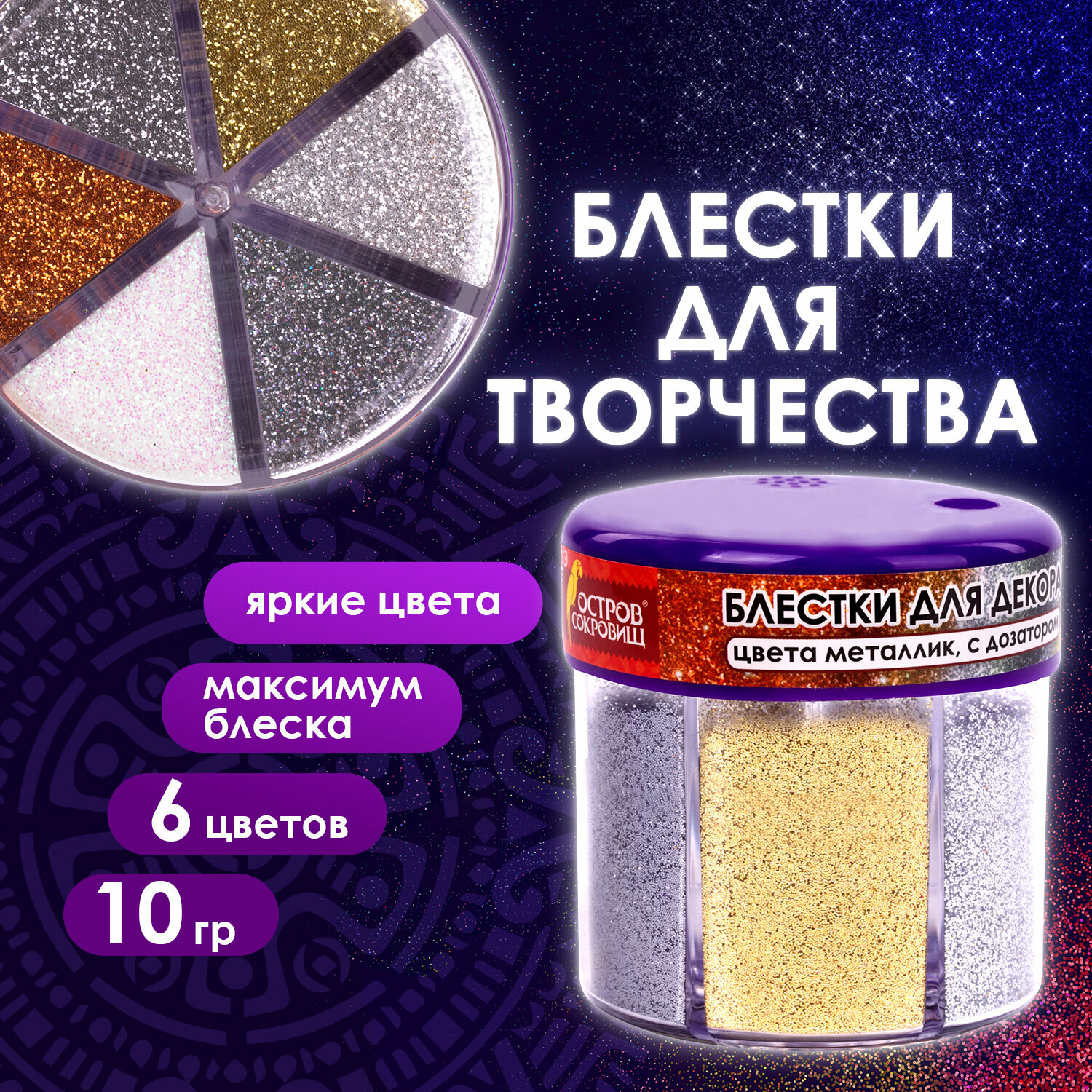 СохранитьБлестки для декора и декорирования (глиттер) для творчества и рукоделия, поделок, Остров Сокровищ, Металлик, диспенсер, 6 цветов по 10 г, 662224 интересное: