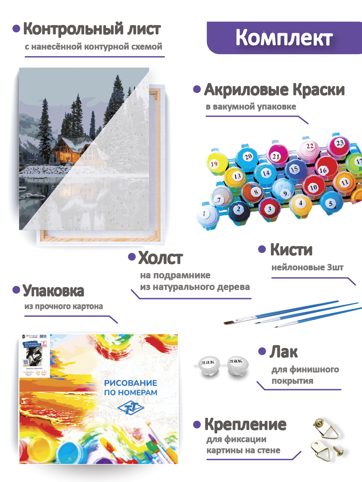 | Комплектация | Кисть (3 шт.);Холст на подрамнике;Набор красок;Настенное крепление для картины |