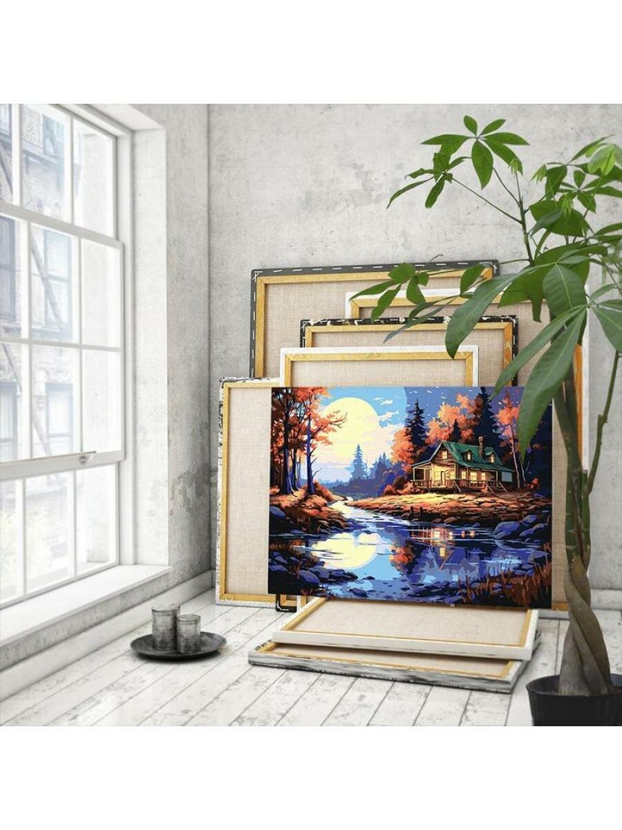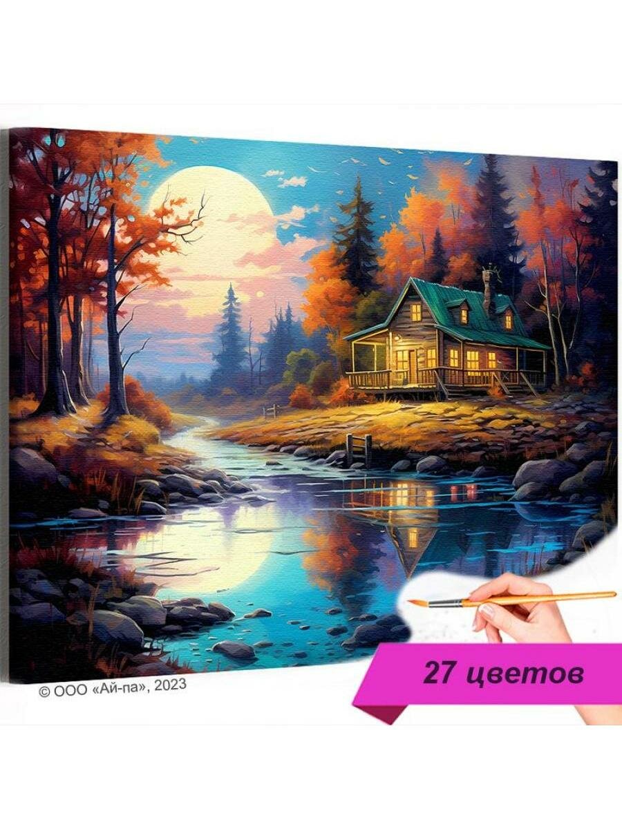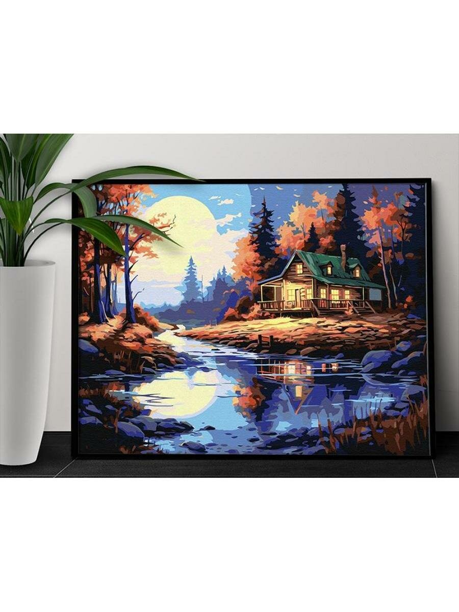 Дом на природе у воды Пейзаж Река Лес Закат Осень Раскраска картина по номерам на холсте 40х50 интересное: