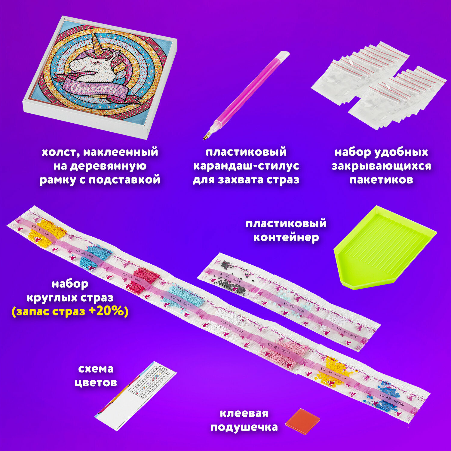 | Комплектация | картонная основа с нанесенной на неё схемой изображений, пронумерованной по цветам; набор круглых акриловых страз различных цветов, пронумерованных в соответствии со схемой; удобные закрывающиеся пакетики для хранения страз; пластиковый карандаш-стилус для захвата страз; клеевая подушечка; пластиковый контейнер; пластиковая подставка; кусочек двустороннего скотча, для крепления подставки к картонной основе; схема соответствия цветов страз и символов на холсте |