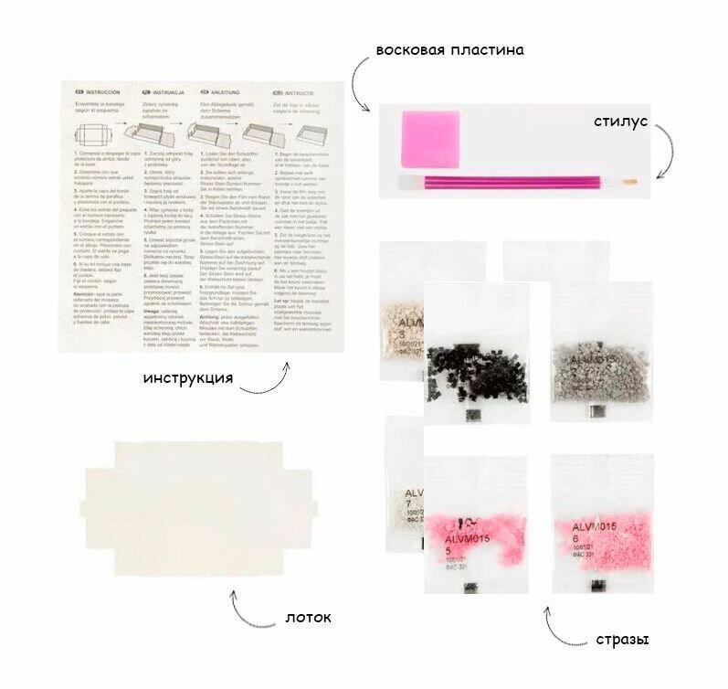 | Комплектация | Лоток, Стилус, Стразы, Цветная схема на клеевой основе с клеевым слоем и защитной пленкой |