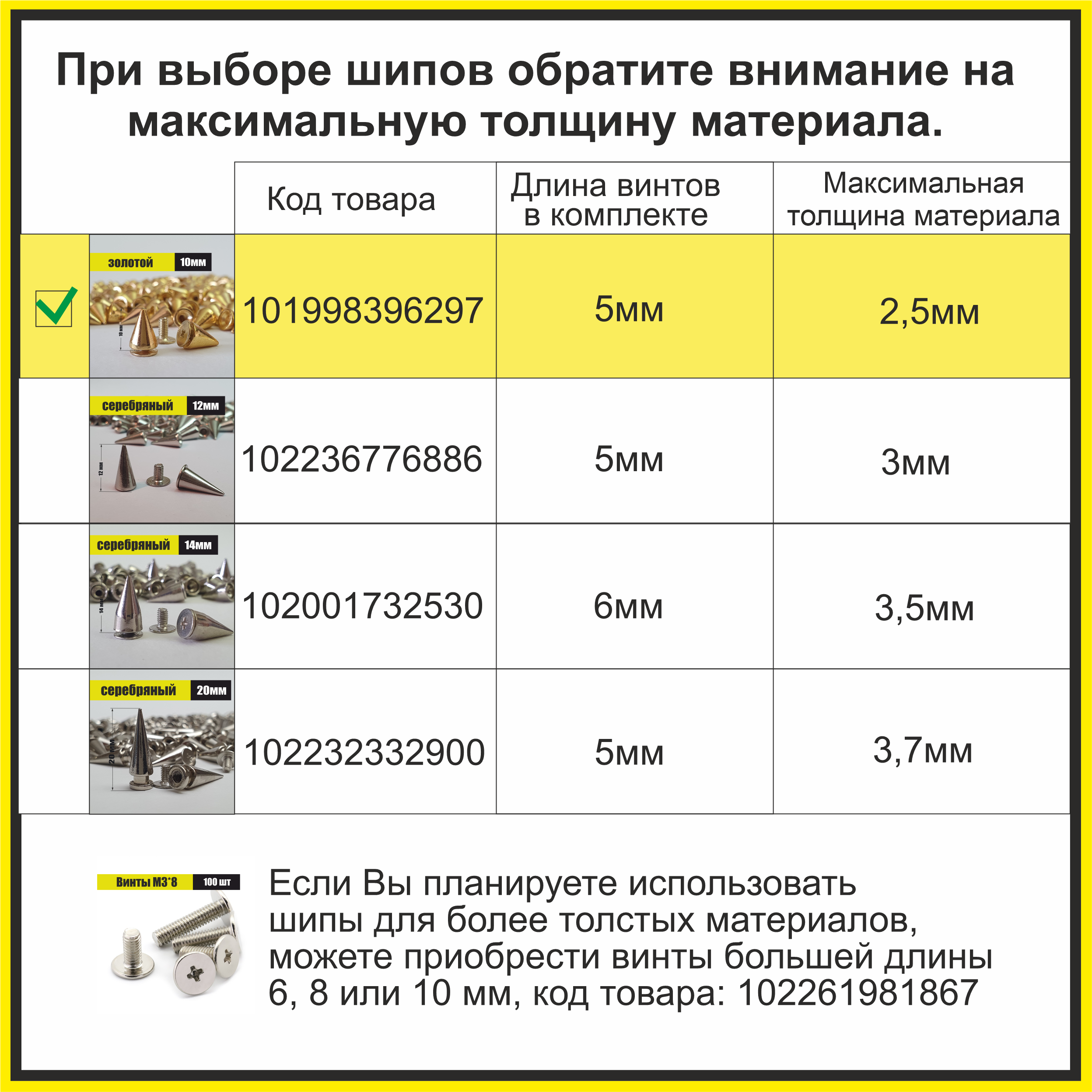 Декоративные шипы для одежды и аксессуаров (золотые 100 шт)