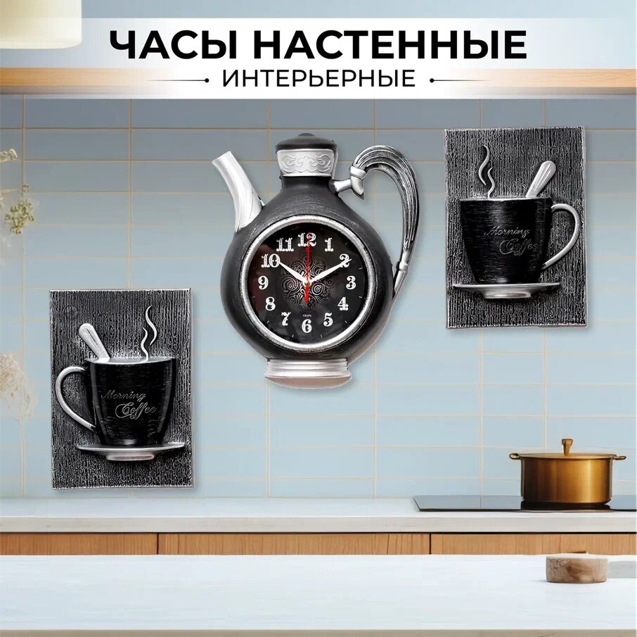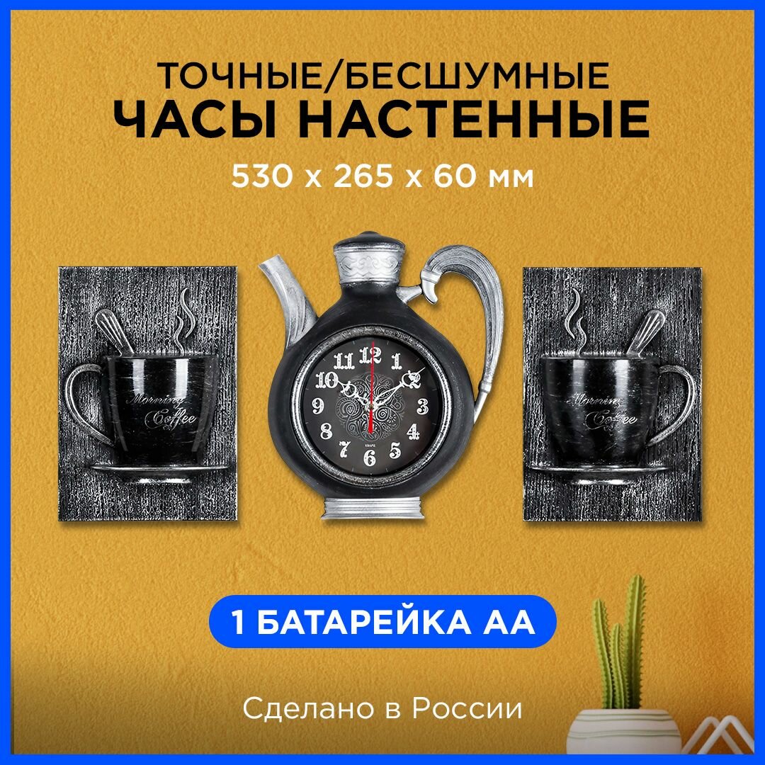 Часы настенные комплект Рубин Чайник + 2 чашки черный с серебром для кухни с плавным ходом арабскими цифрами корпус пластик металл минеральное стекло работа от пальчиковой батарейки АА ширина 53 см