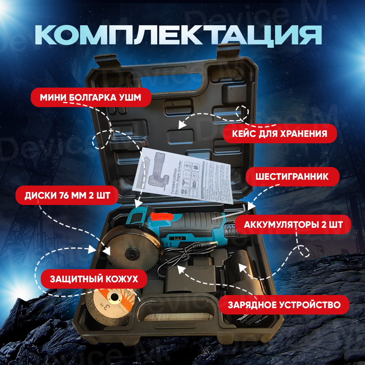 | Комплектация | Кейс; углошлифовальная машина - 1шт; аккумулятор 2шт; зарядное устройство 1шт; отрезной алмазный диск 2шт; ключ шестигранный-1шт |