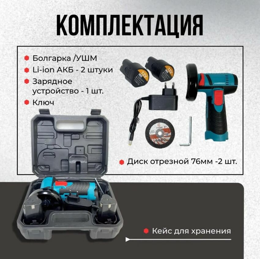 | Комплектация | -Кейс для хранени -Болгарка / УШМ; -АКБ 12В 1,3 А*ч - 2 шт; -зарядное устройство сетевое для АКБ; -ключ; -отрезной диск 76мм - 2 шт. |