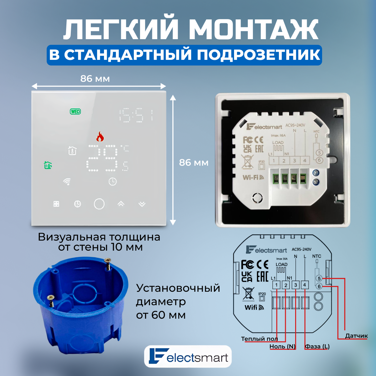 EST-220W-YM Терморегулятор с WiFi для теплого пола электрического и водяного, универсальный с датчиком, программируемый термостат, голосовое управление Яндекс Алиса, серый. 3500 Вт, ELECTSMART