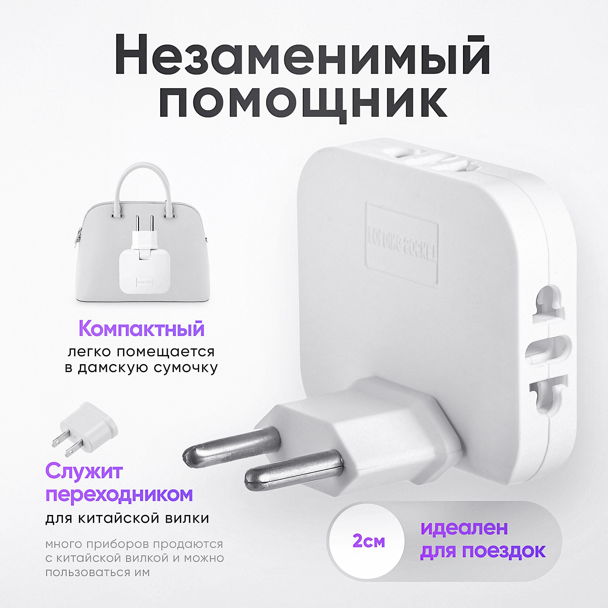 Адаптер сетевой на евровилку, евро розетку GSMIN Travel Adapter A34 переходник для американской, китайской вилки US/CN (250 В, 10А), 2шт (Белый)