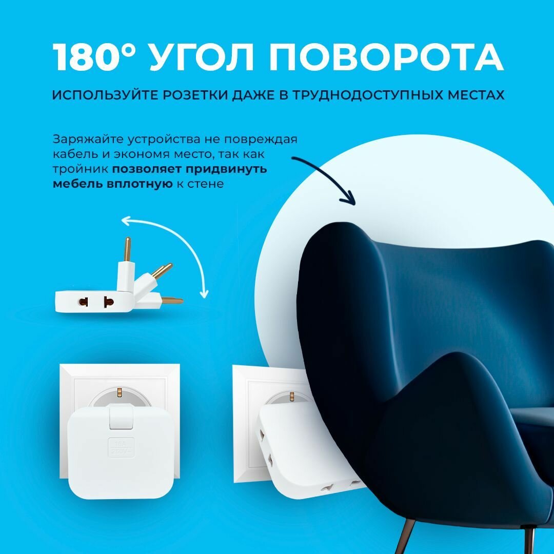 Тройник поворотный Progix для розетки, плоский сетевой разветвитель, 180 градусов, электрический переходник 250В, 16А, белый интересное: