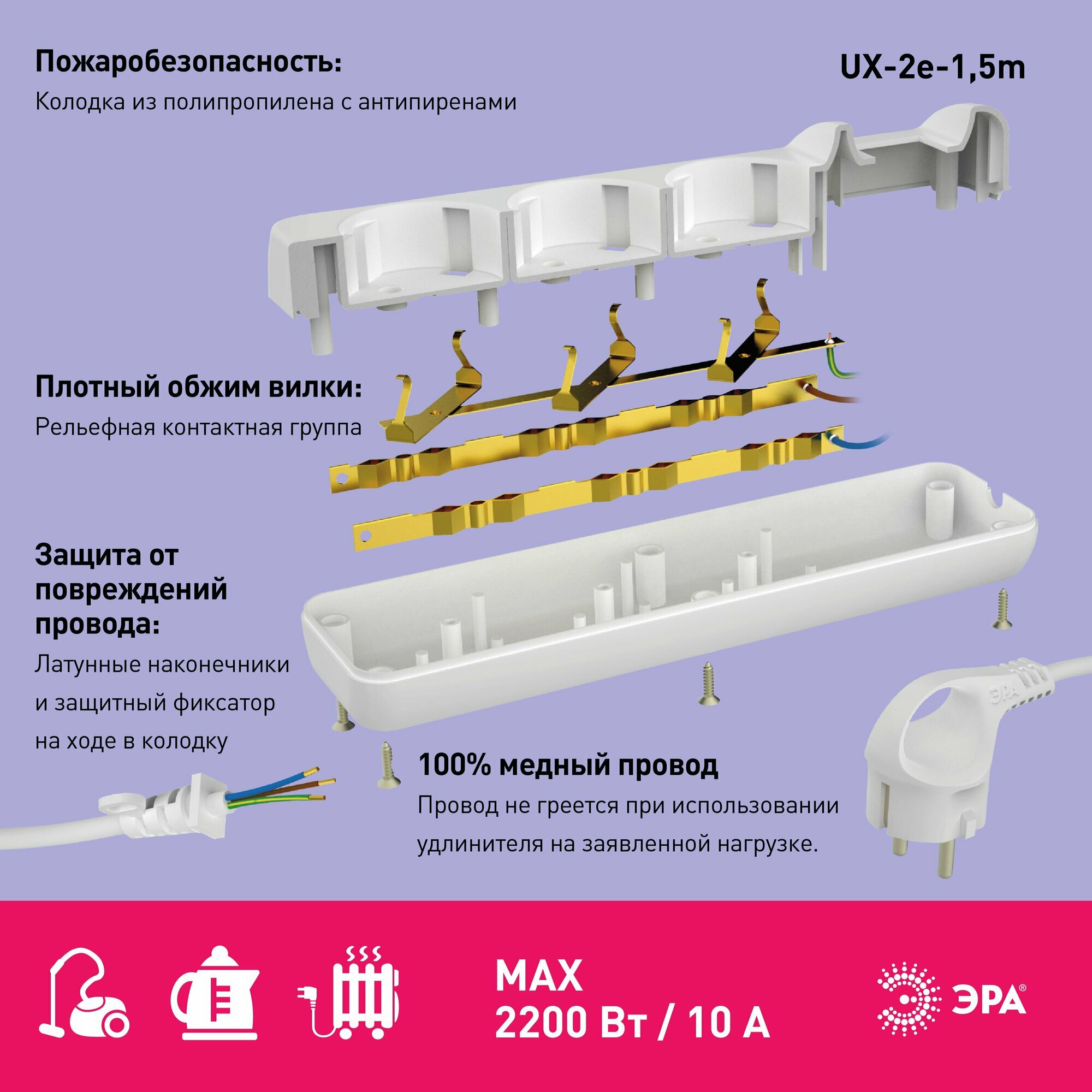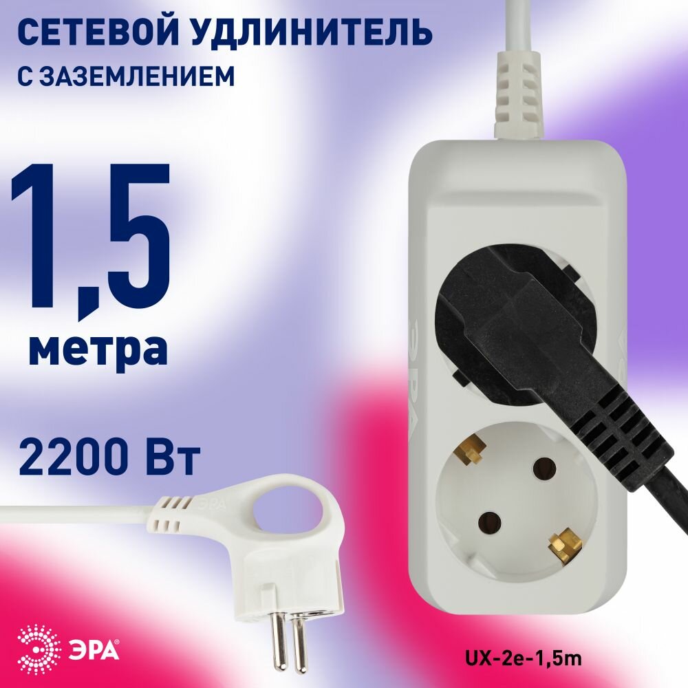 Удлинитель сетевой электрический с заземлением ЭРА UX-2e-1,5m 2 розетки, 1,5м, 10А, 3x0,75мм2