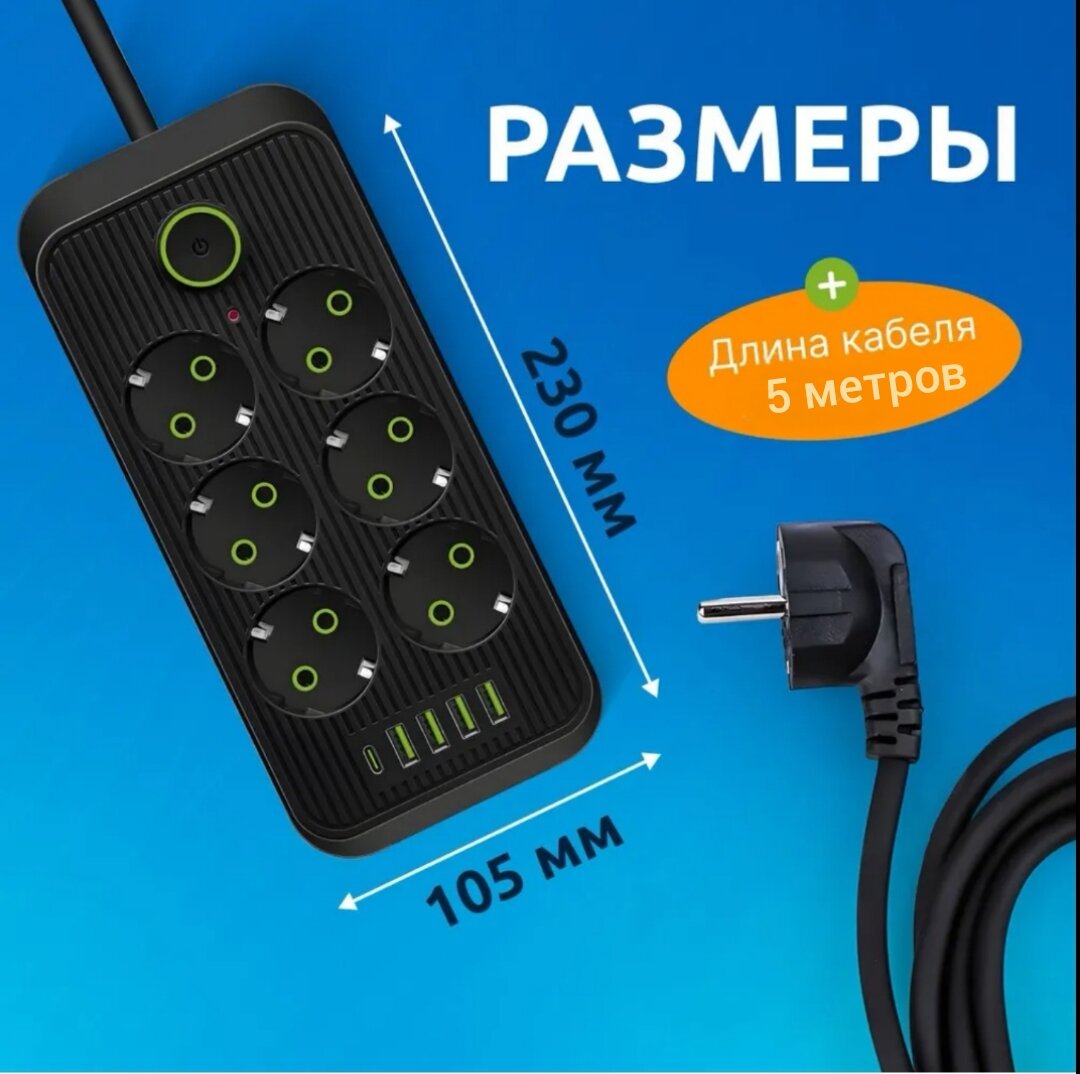 Купить Удлинитель сетевой (фильтр) 5 метров 6 розеток с 4 USB и 1 Type-C портами и кнопкой черный