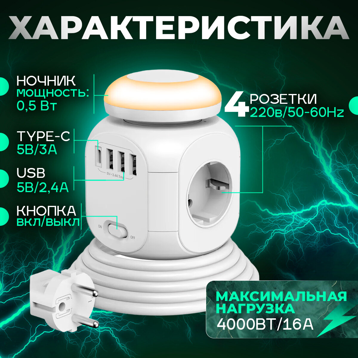 | Дополнительная информация | ночник светильник, TYPE-C порт, USB порты, наличие выключателя и заземление |