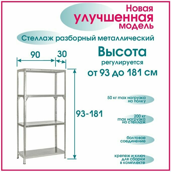 Стеллаж высота 93-181 см, 4 полки 90*30 см разборный металлический интересное: