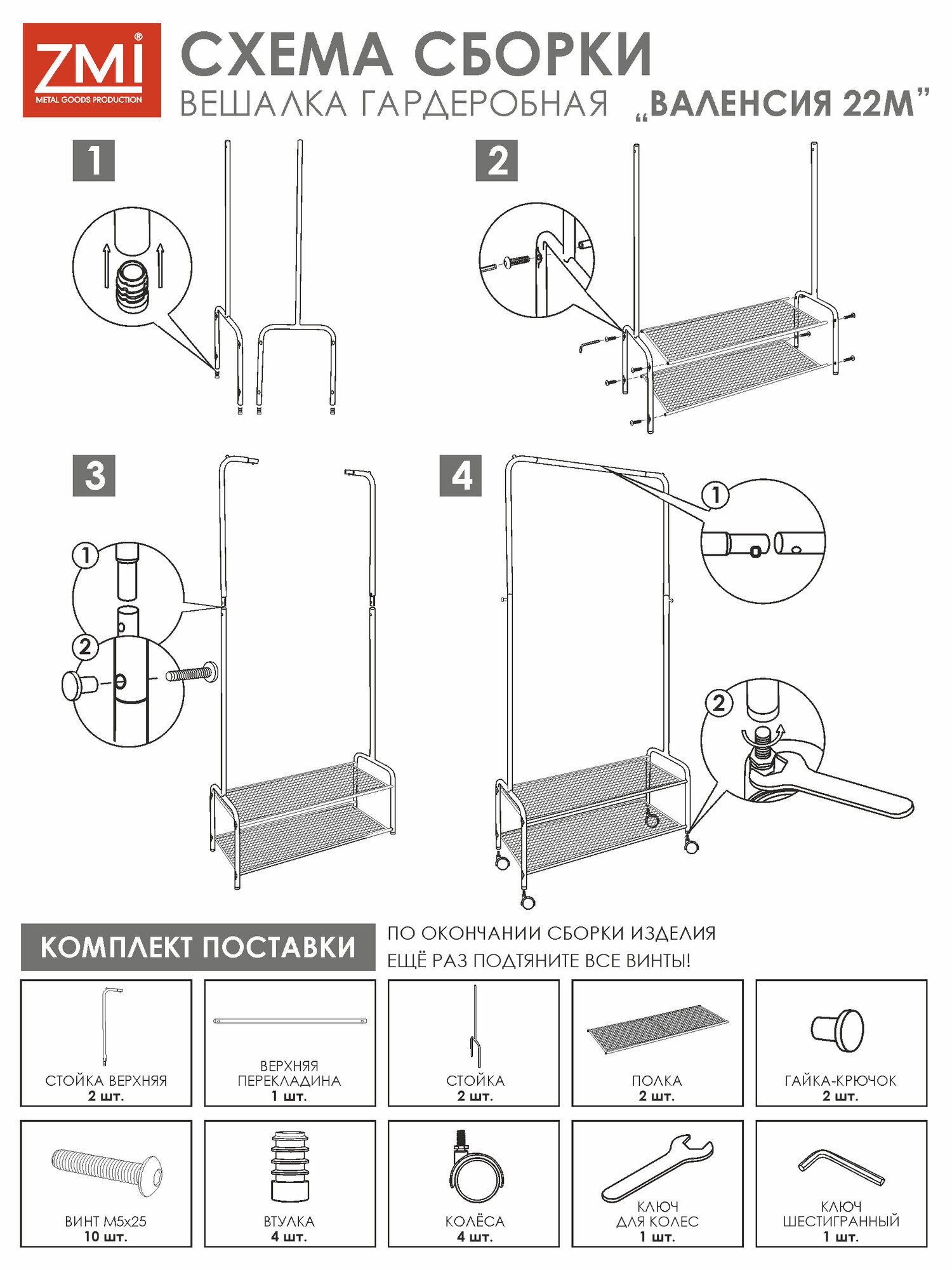 | Комплектация | Вешалка гардеробная "Валенсия 22М" с двумя полками / на колесах / металлик |