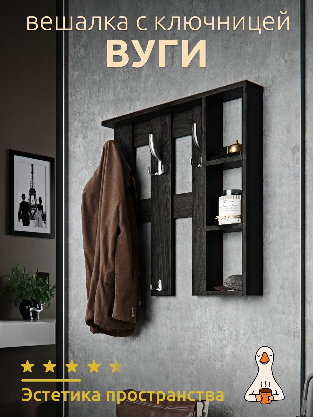 Вешалка, настенная, деревянная с полками в прихожею для одежды, 68x17x68 см. интересное: