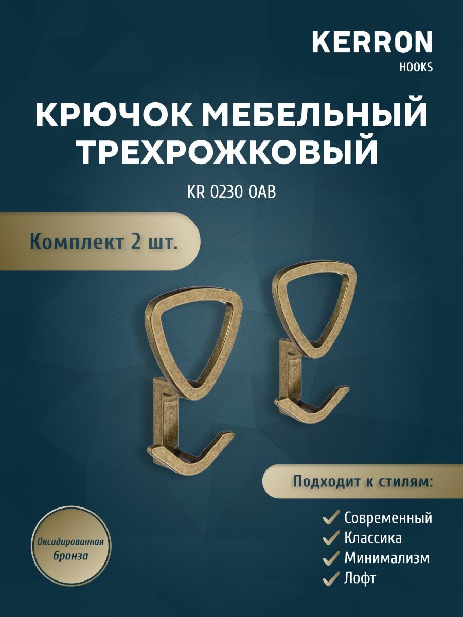 Мебельный крючок для одежды KERRON KR 0230 OAB / 3 рожка, трехрожковый / Цвет оксидированная бронза