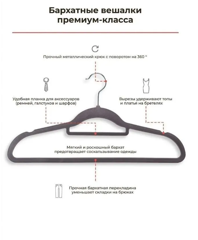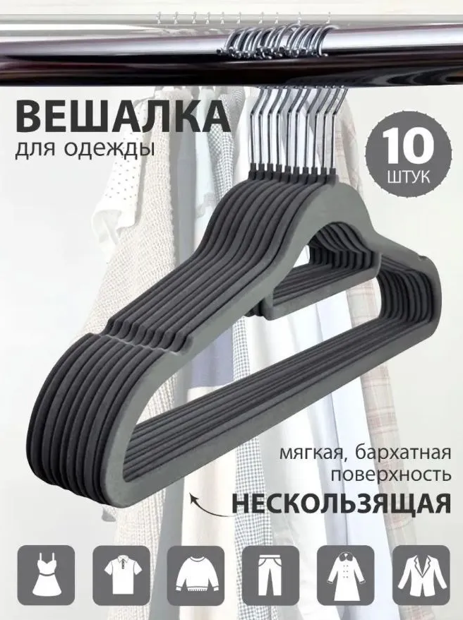 Вешалки-плечики бархатные для одежды, цвет серый, набор 10шт, длина 41см. интересное: