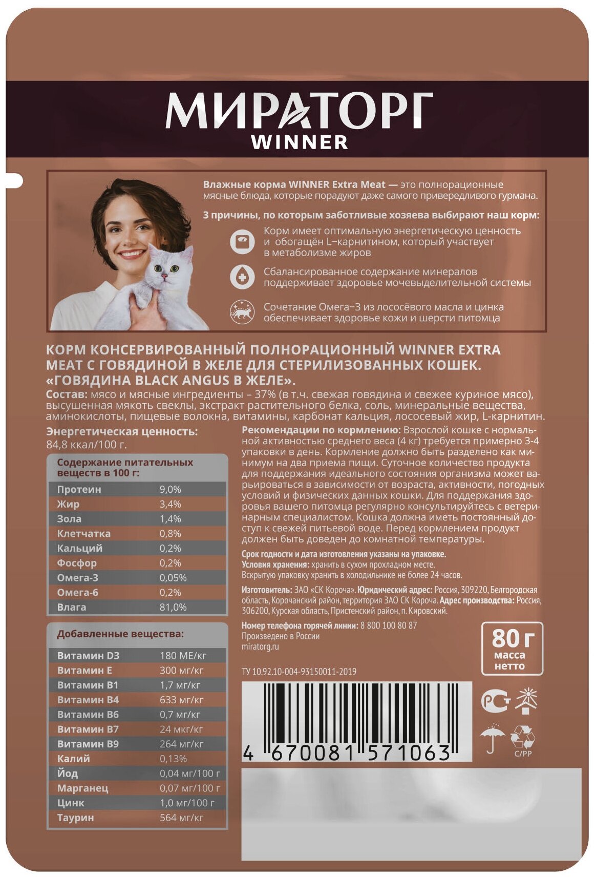 Корм конс. полнорационный Winner Extra Meat с говядиной в желе для стерилизованных кошек "Говядина Black Angus в желе" 0,08 кг*24 (1,92кг) интересное: