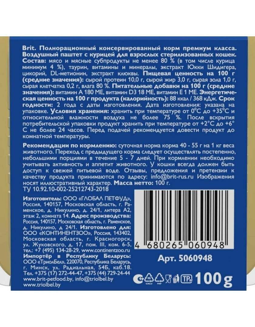 Влажный корм для стерилизованных кошек Brit Воздушный паштет с курицей 14 шт х 100 г интересное: