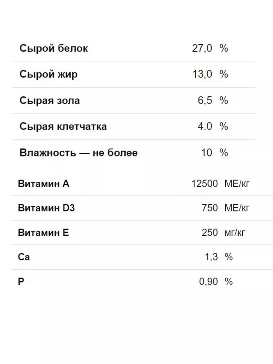 | Минеральные вещества | Сырая зола 6,5%, сырая клетчатка 4%, влажность не более 10%, витамин А 12500 МЕ/кг, витамин D3 750 МЕ/кг, витамин Е 250 мг/кг, кальций 1,3%, фосфор 0,9% |
