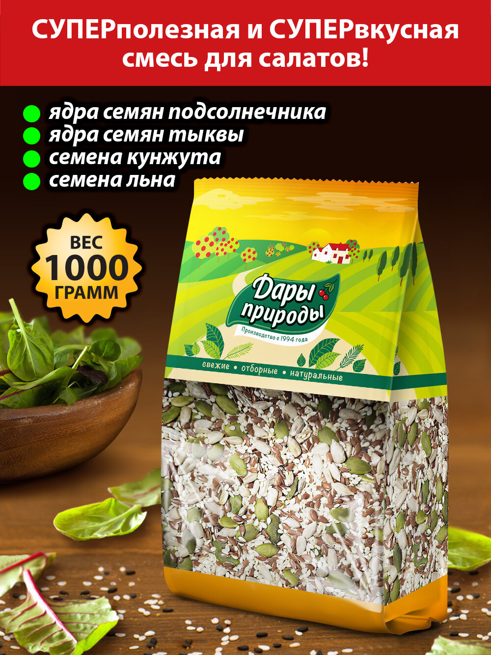 Купить Смесь семян для салата Дары природы салатная смесь из семечек подсолнечника, тыквы, льна и кунжута, 1 кг
