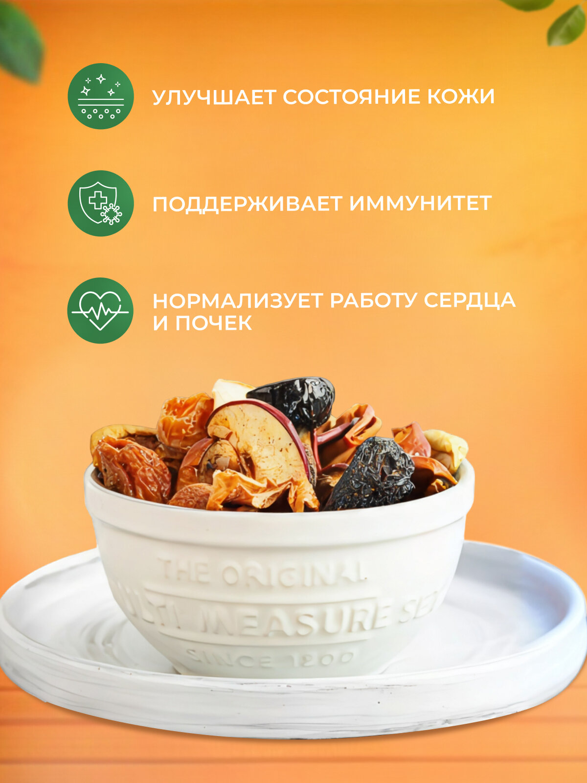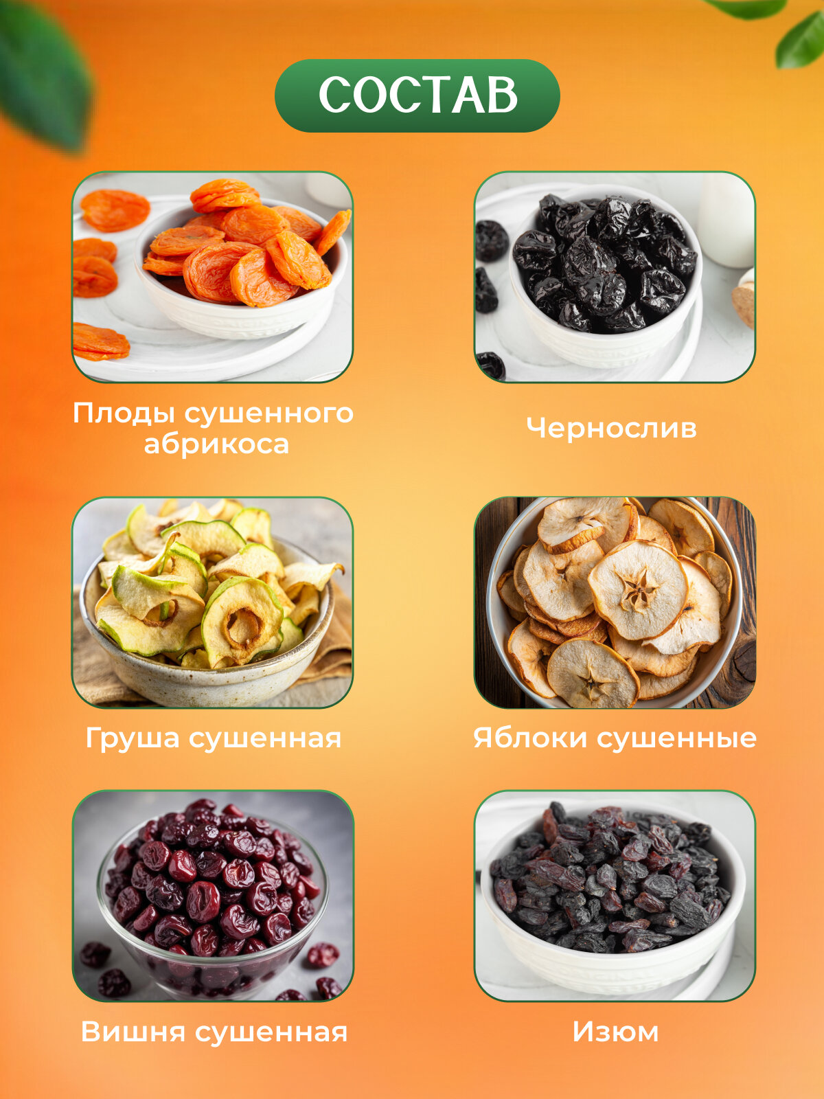 | Состав | сушенный абрикос, сушенная груша, сушенный чернослив, сушенное яблоко, сушенная вишня, изюм |