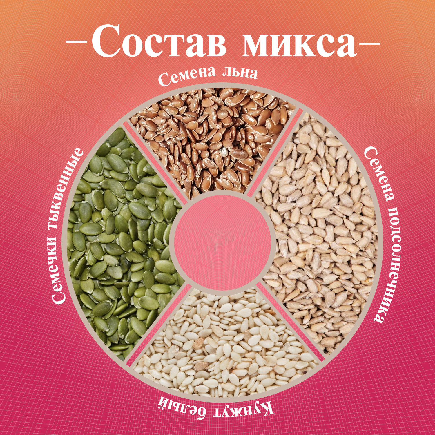 | Состав | Семена тыквы очищенные, Семена подсолнечника очищенные, Кунжут чёрный, Кунжут белый, Семена льна |