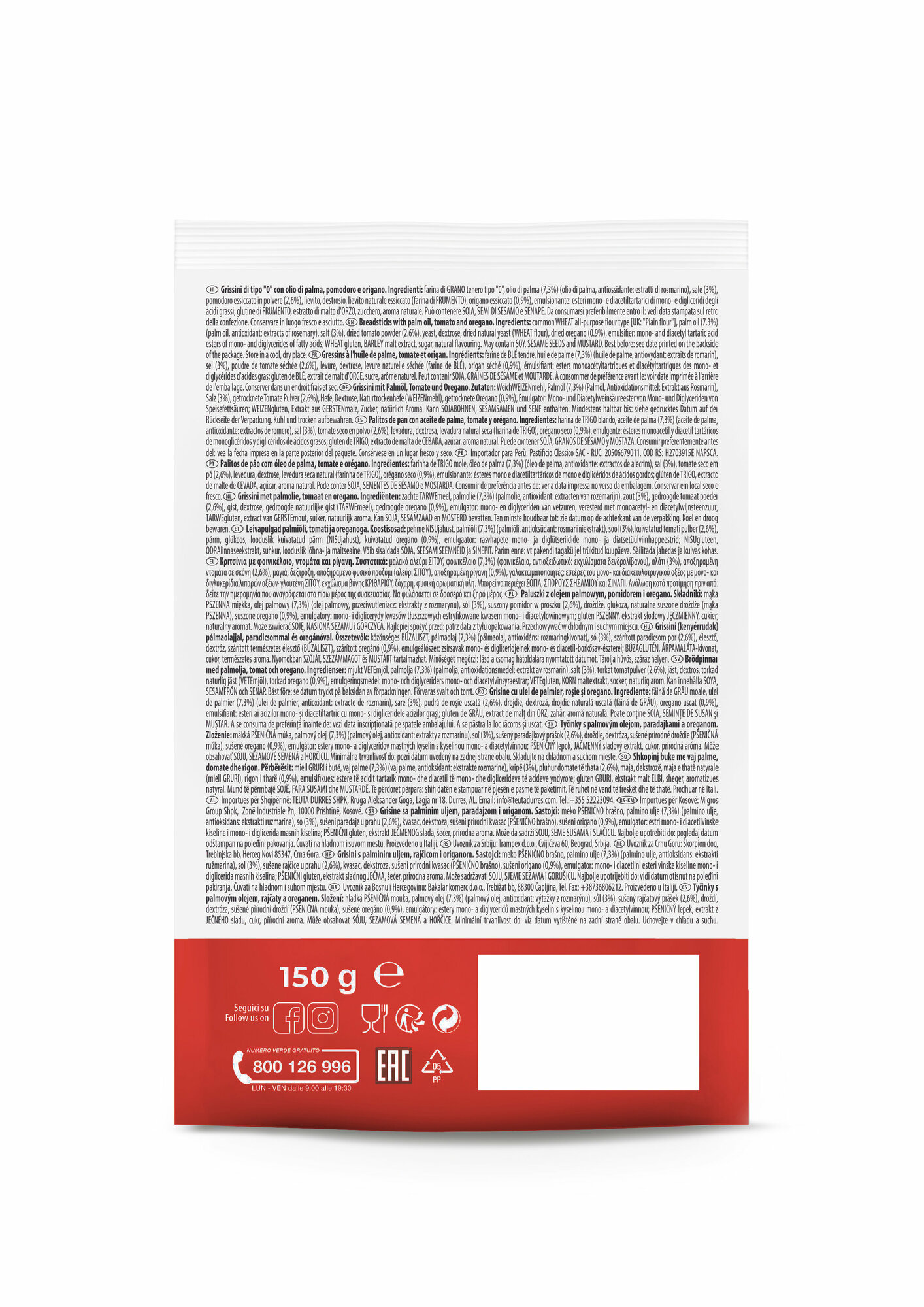 | Состав | мука мягких сортов тип 0, пальмовое масло (6,4%), дрожжи, соль, обезвоженный томат (1,2%), декстроза, орегано (0,6%), эмульгатор: Е472, экстракт солода, глютен, пищевые ароматизаторы, антиокислитель: экстракт розмарина |