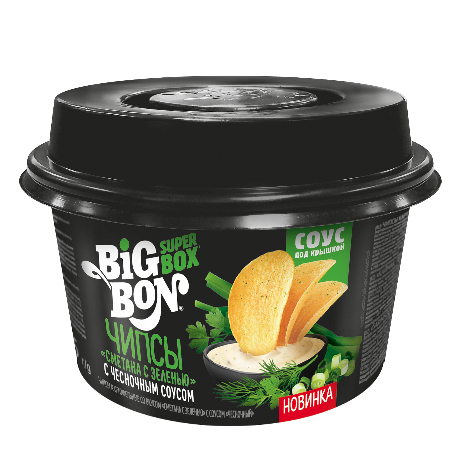 Купить Чипсы Big Bon Super Box Сметана и зелень с чесночным соусом чашка 105г