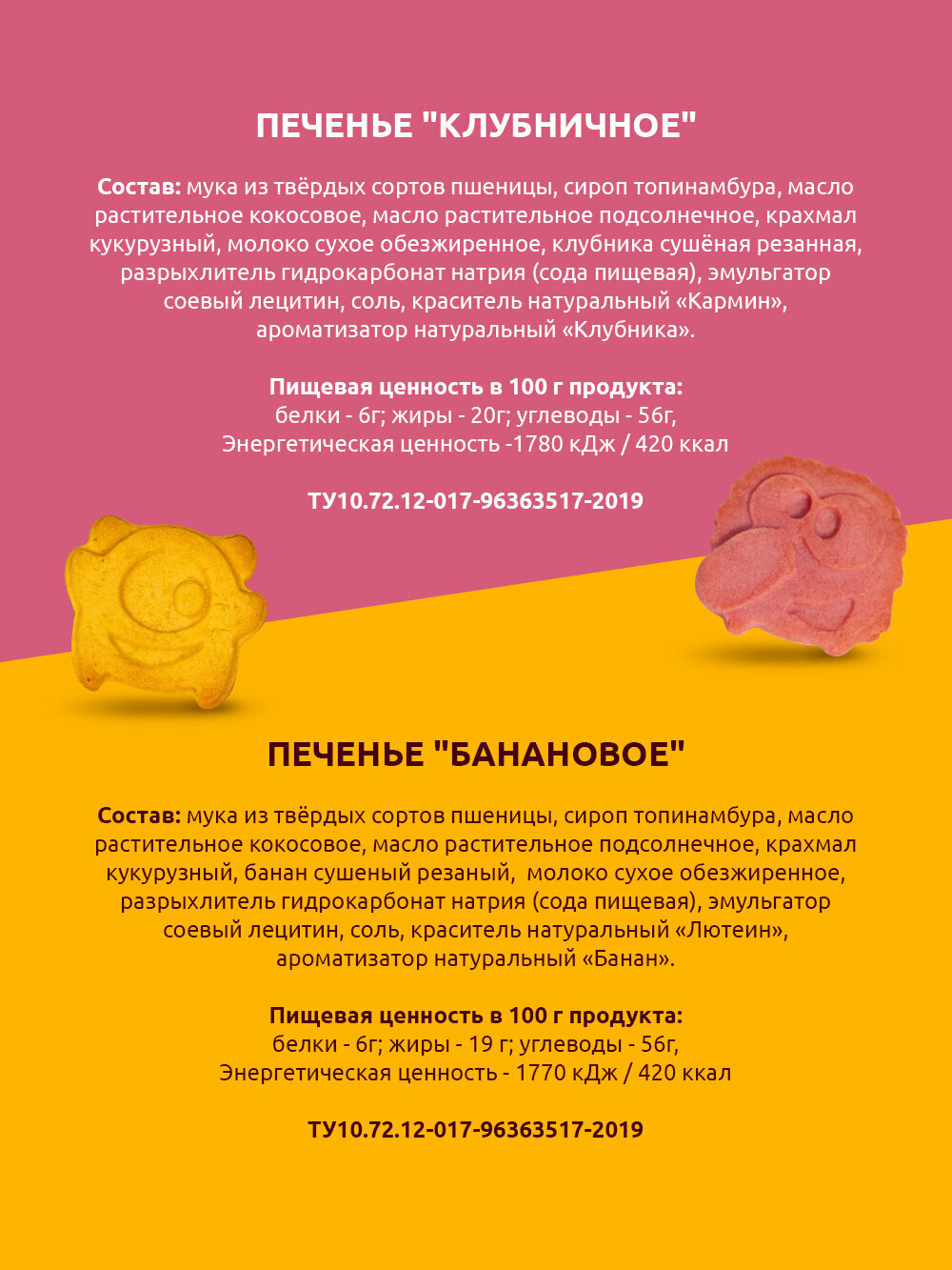 | Состав | мука из твердых сортов пшеницы, сироп топинамбура, масло растительное кокосовое, масло растительное подсолнечное, крахмал кукурузный, молоко сухое обезжиренное, клубника сушеная резанная, разрыхлитель гидрокарбонат натрия (сода пищевая), эмульгатор соевый лецитин, соль, краситель натуральный «Кармин», ароматизатор натуральный «Клубника». |