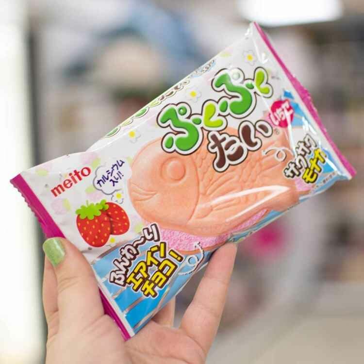 Печенье Тайяки вафельное Рыбка Пуку-пуку с начинкой из пористого клубничного шоколада (16,5 г) интересное: