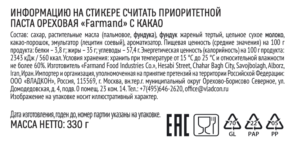 Паста Farmand молочно-ореховая с какао 330гр 1шт