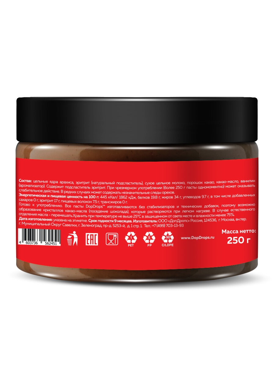 Купить Арахисовая паста DopDrops шоколадная с темным шоколадом 250 г