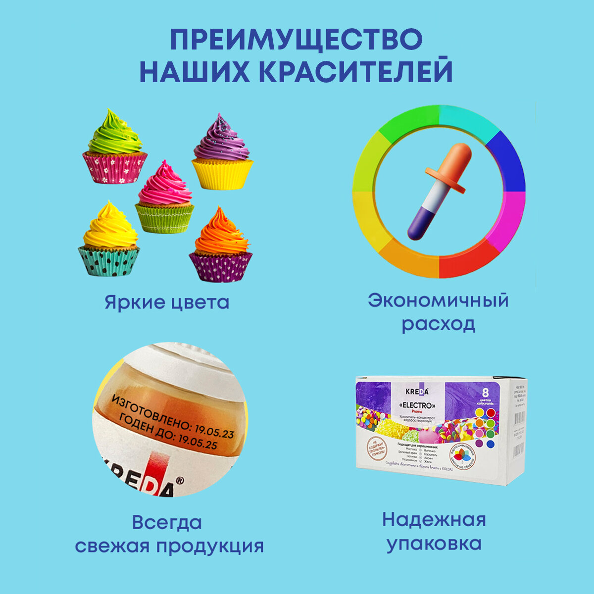 | Состав | Набор пищевых красителей - 8 шт, коробка - 1 шт |