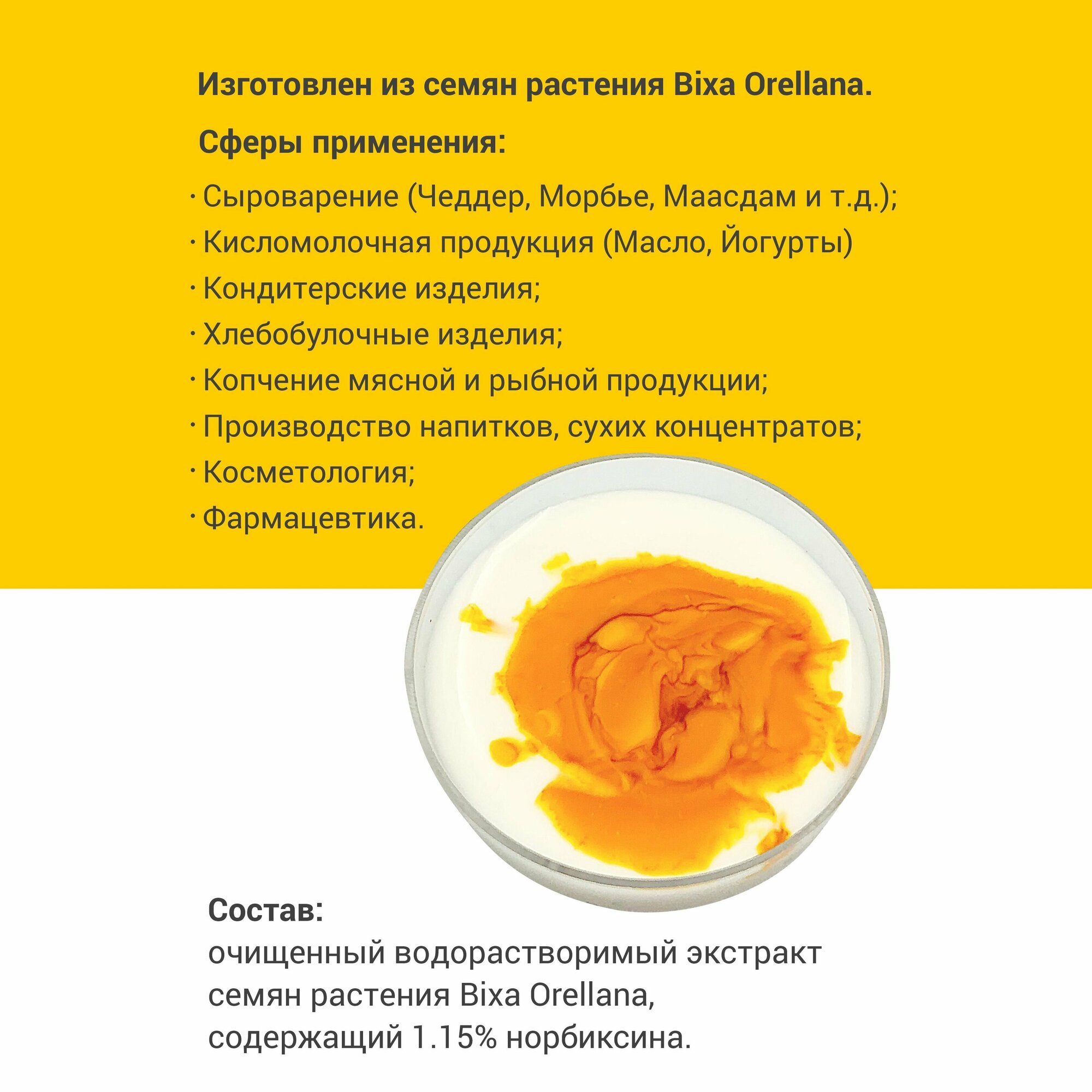| Состав | Очищенный водорастворимый экстракт семян растения Bixa Orellana, содержащий 1.15% норбиксина |
