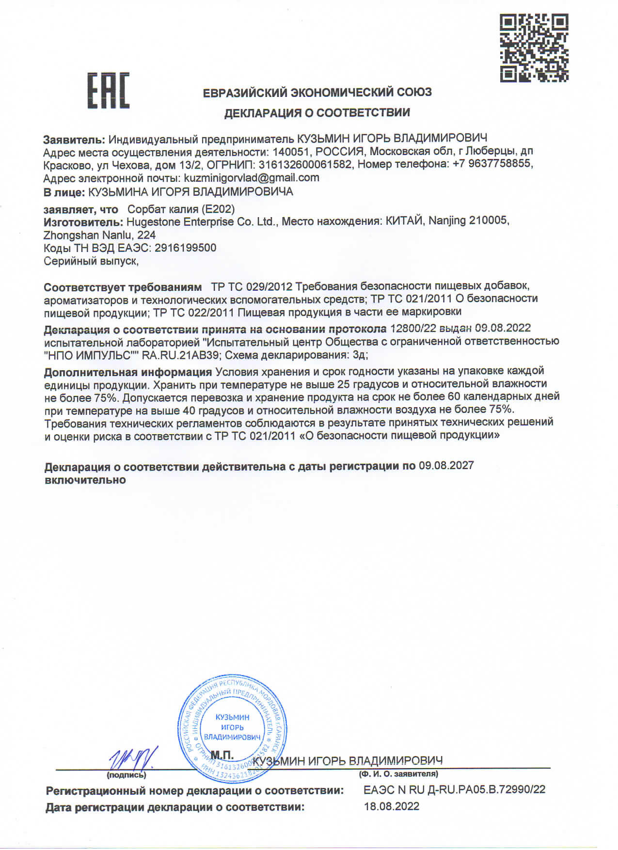 Сорбат калия Е202