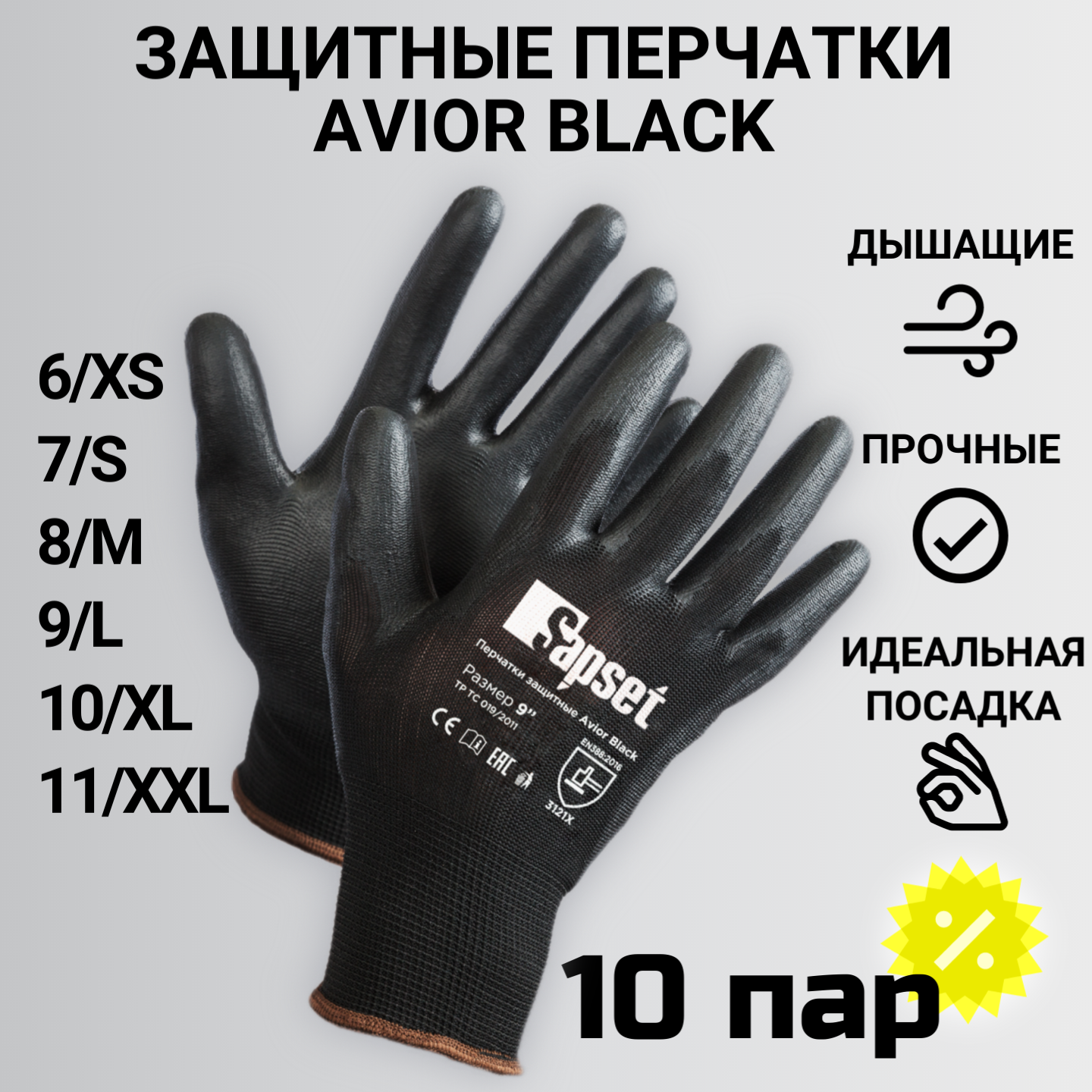 Купить Перчатки рабочие Sapset Avior Black с покрытием из полиуретана, размер XL/10 - 10 пар