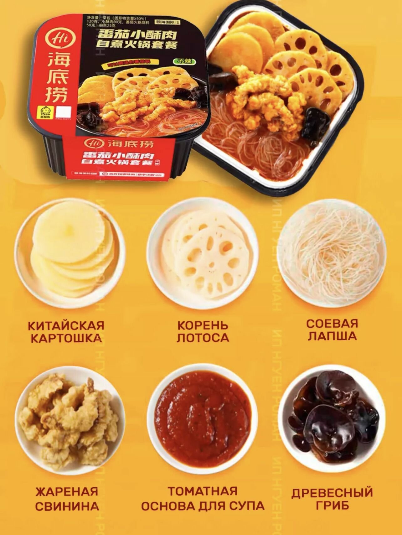 Саморазогревающаяся лапша Haidilao HotPot с хрустящей свининой и томатом интересное: